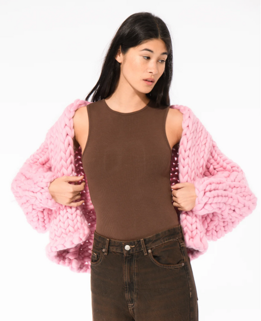 Hope is best known for her creation of the signature statement piece, the Colossal Knit Cardigan. Unable to find pieces to make from other’s knitting patterns, she developed her own method, just by using her hands. By mastering a unique knitting technique that uses no needles, Hope has trained her knitters to create her designs, her favourites made from sustainably sourced materials like luxury merino wool.