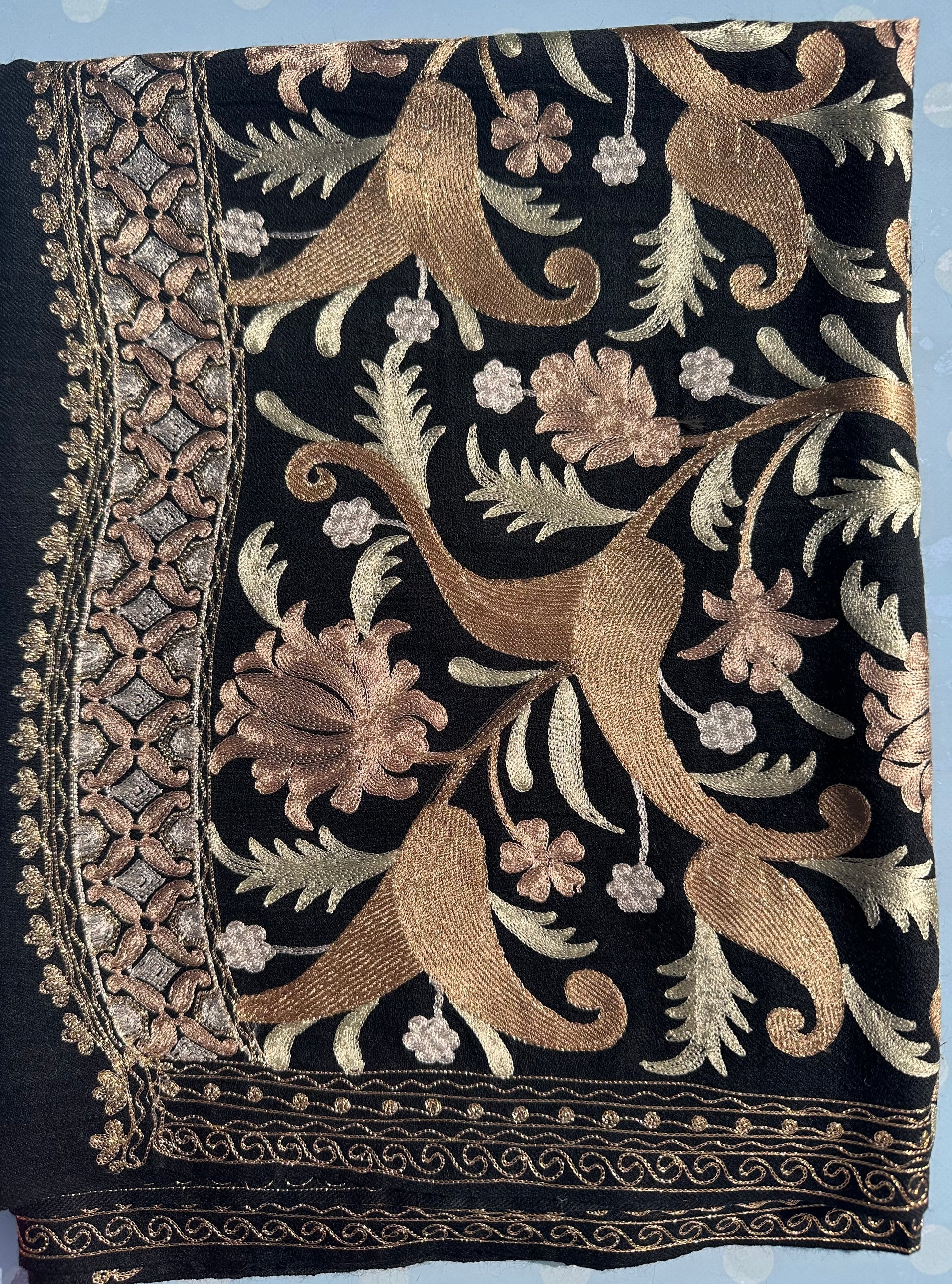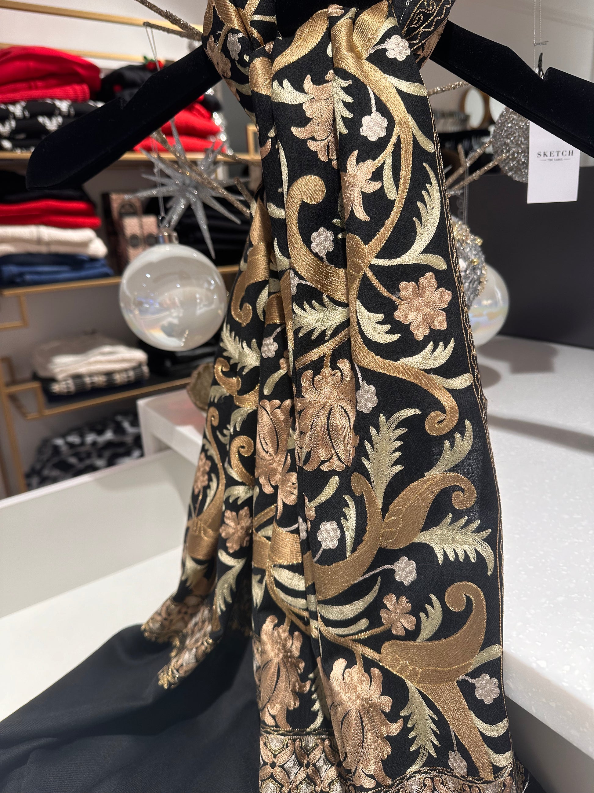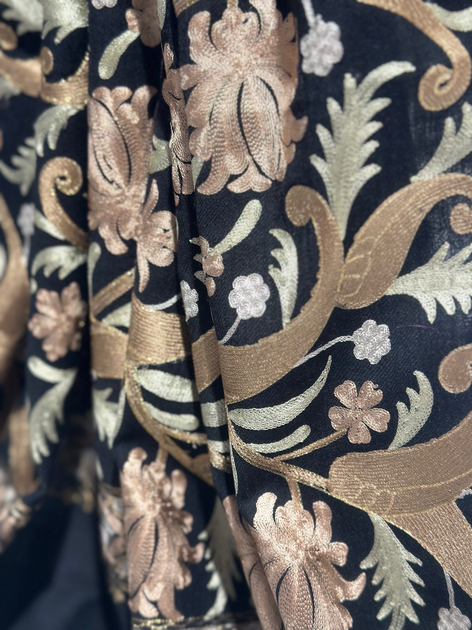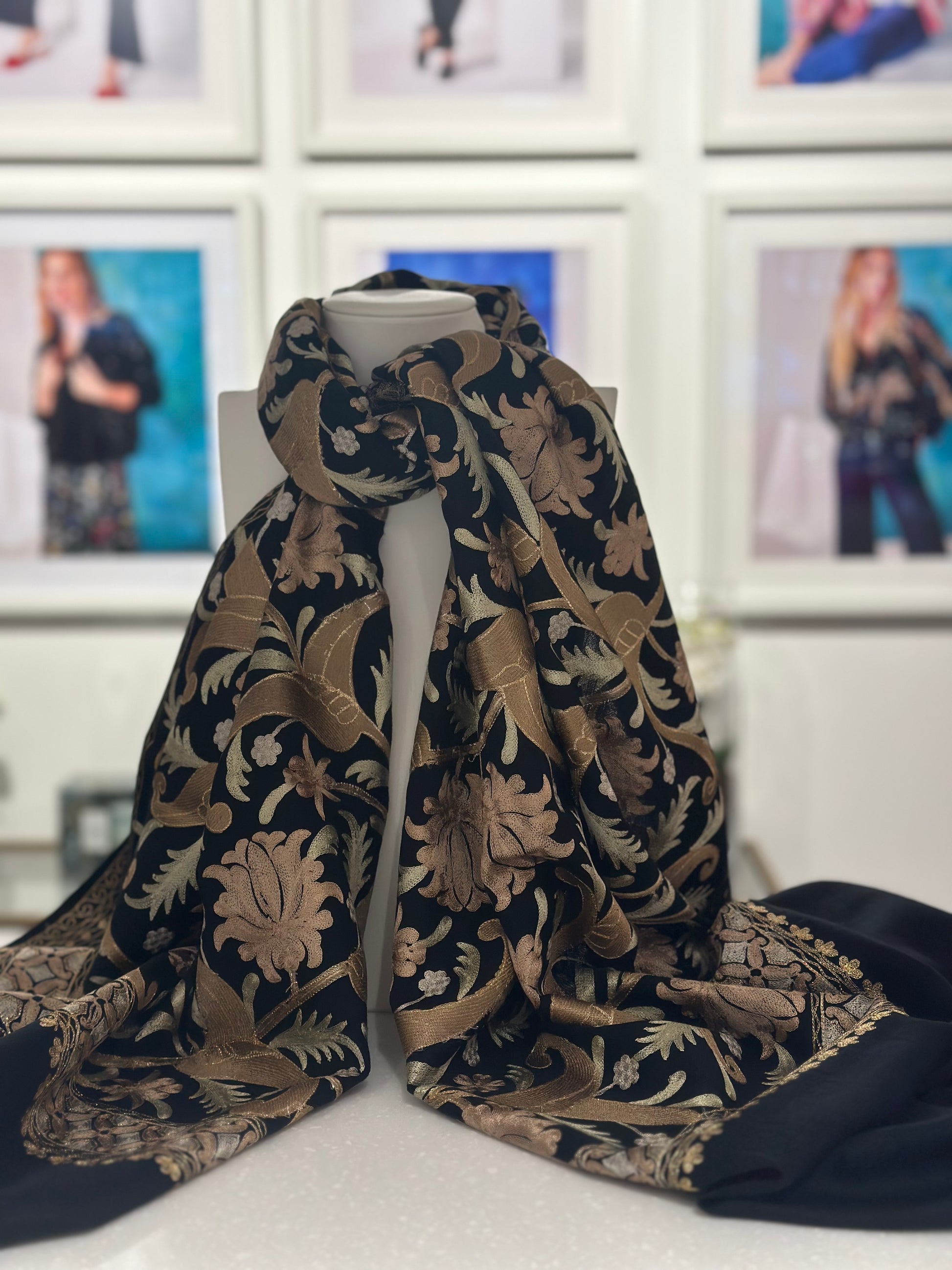 This enchanting hand-embroidered wrap is a masterpiece of craftsmanship, adorned with delicate floral motifs that dance across the fabric in rich shades of bronze and gold. The intricate embroidery brings the flowers to life, with the warm metallic threads adding depth and dimension to the design. The combination of bronze and gold creates a timeless elegance, evoking a sense of opulence and natural beauty. Each stitch is carefully placed by hand, making this wrap a luxurious, one-of-a-kind accessory that effortlessly elevates any ensemble with its refined, floral charm.