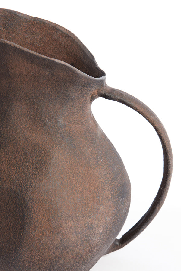 The dark finish reveals subtle variations in tone, enhancing the texture and creating a depth that catches light minimally, adding to its understated elegance. This vase is perfect as a standalone piece or with dry winter branches or foliage, bringing a grounded, earthy quality to any space. The combination of pottery-inspired design with the robustness of iron makes it a striking statement piece, blending artisanal warmth with industrial strength.
