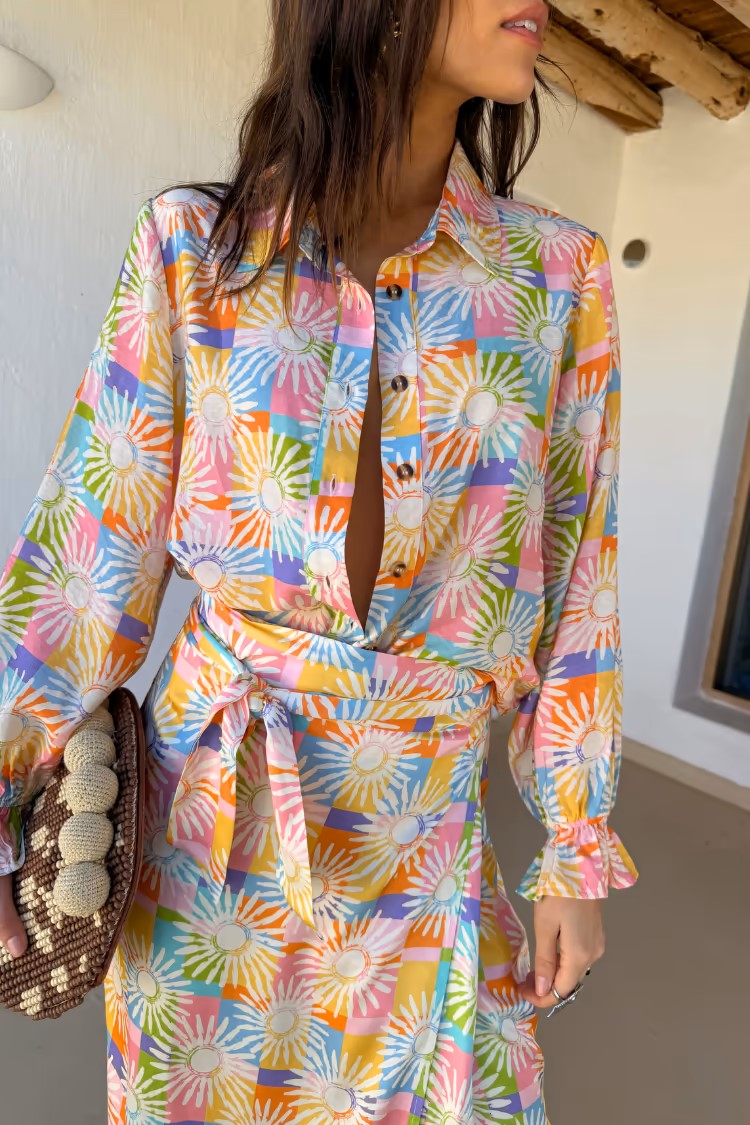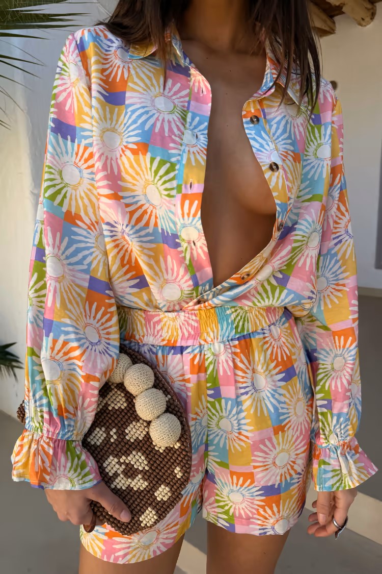 This sun-kissed beach shirt captures every colour of the Ibiza sunset — a wearable horizon melting into fabric. At the collar, a soft blush of coral pink mirrors the sky’s first farewell. Golden amber and honey spill across the chest like liquid sunlight, fading into hues of burnt orange and tangerine as the sun dips lower. Along the sleeves, rich magentas and deep fuchsias pulse like the sky’s final flare, while hints of violet and indigo wrap the hem in the twilight's embrace. Woven from breathable, salt-kissed cotton, it feels like late afternoon warmth and sea breeze on skin — a sunset you can wear, wherever the tide takes you.