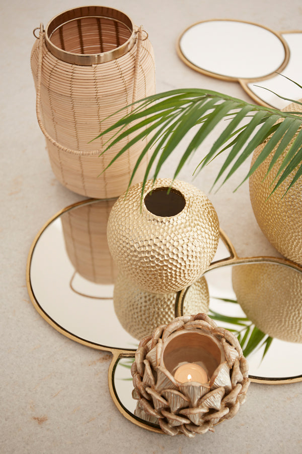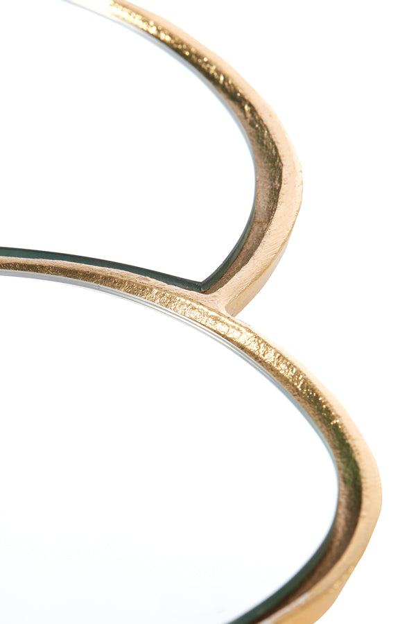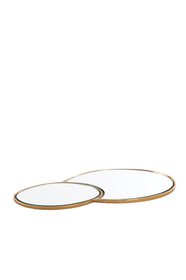 The Cirilo double-mirror plate, designed as a refined display piece for showcasing jewellery and other small treasures. The plate consists of two layered mirrors, each carefully crafted to create depth and reflection. The edges of the mirrors are bordered in a painted gold trim, adding a touch of classic elegance with a warm, metallic gleam that highlights whatever is placed upon it.
