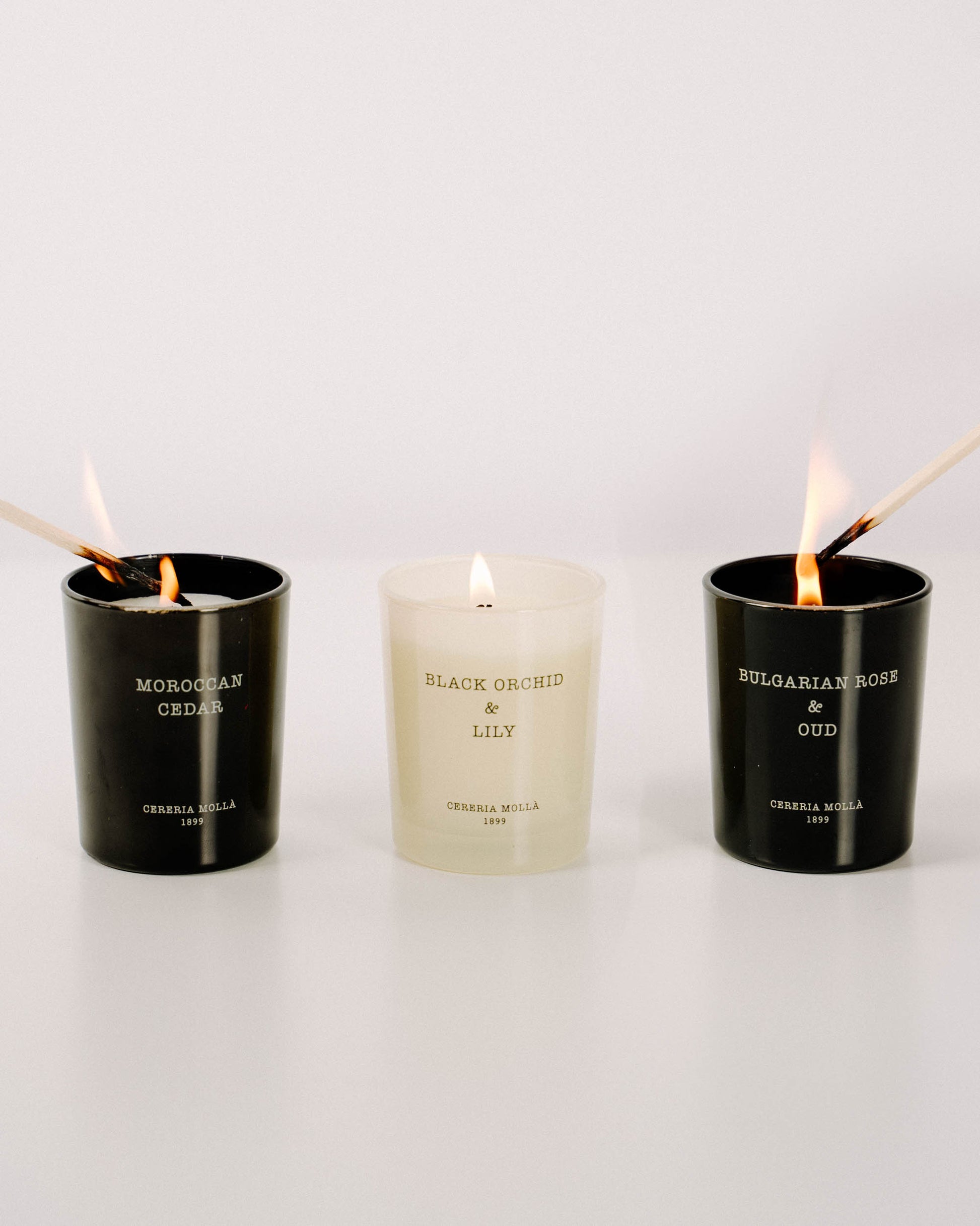 This beautiful set includes 3 mini candles, Bulgarian Rose & Oud, Black Orchid & Lily, Amber & Sandalwood.