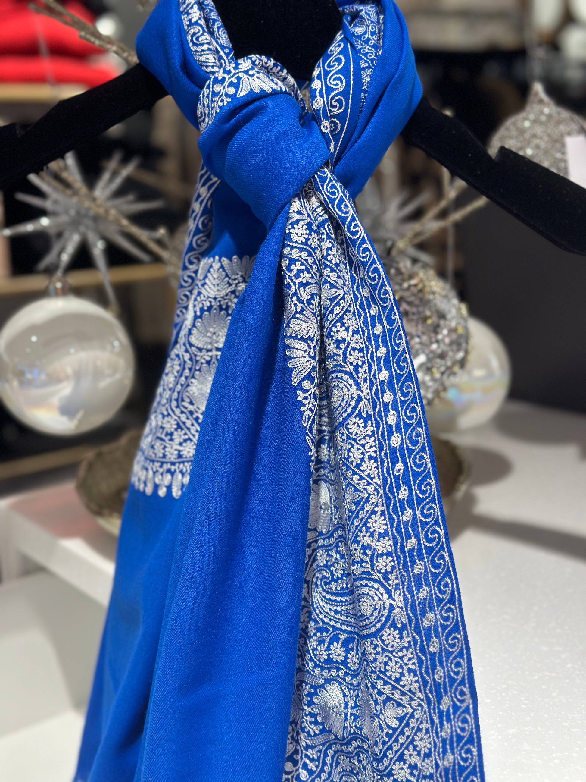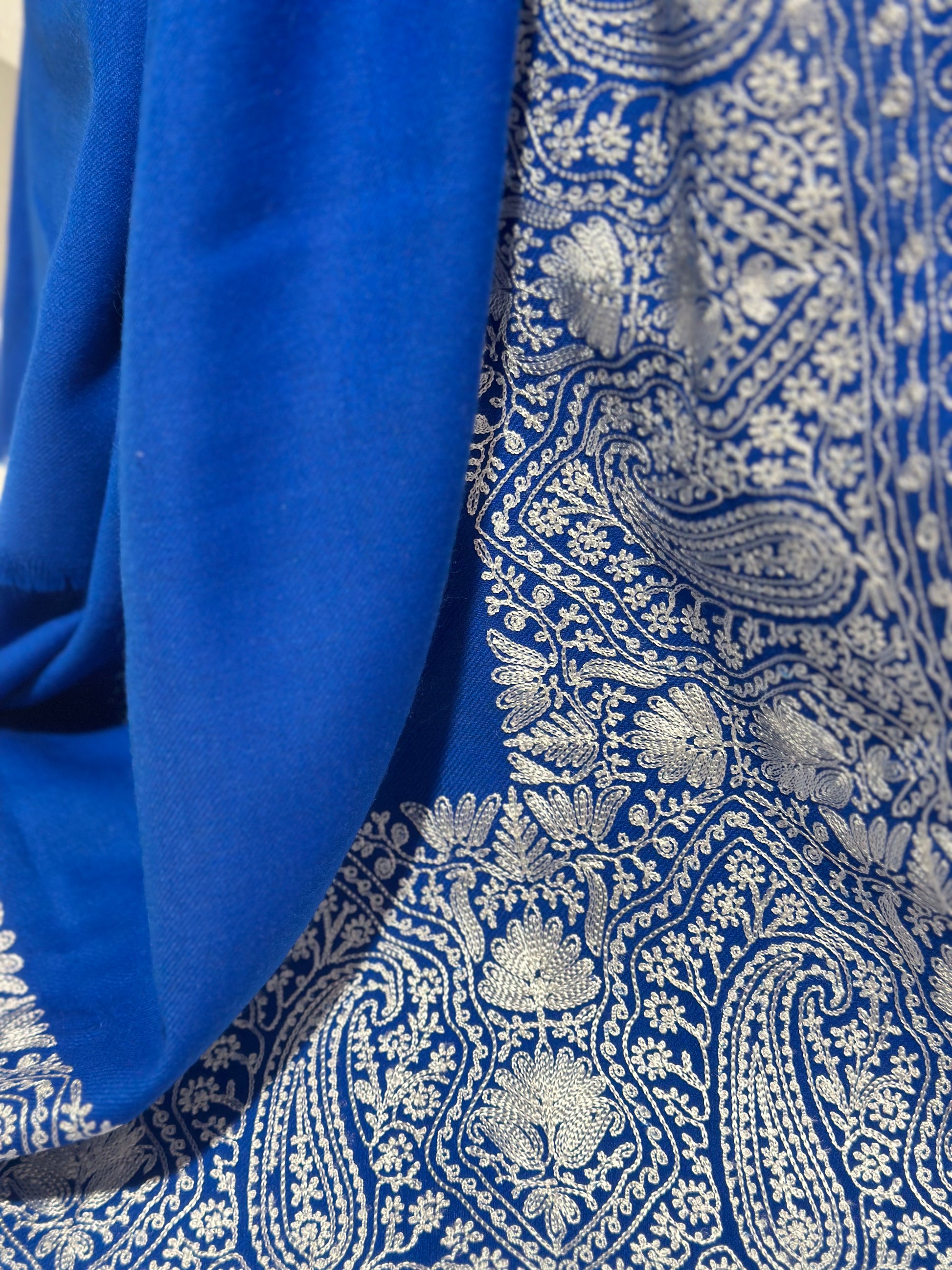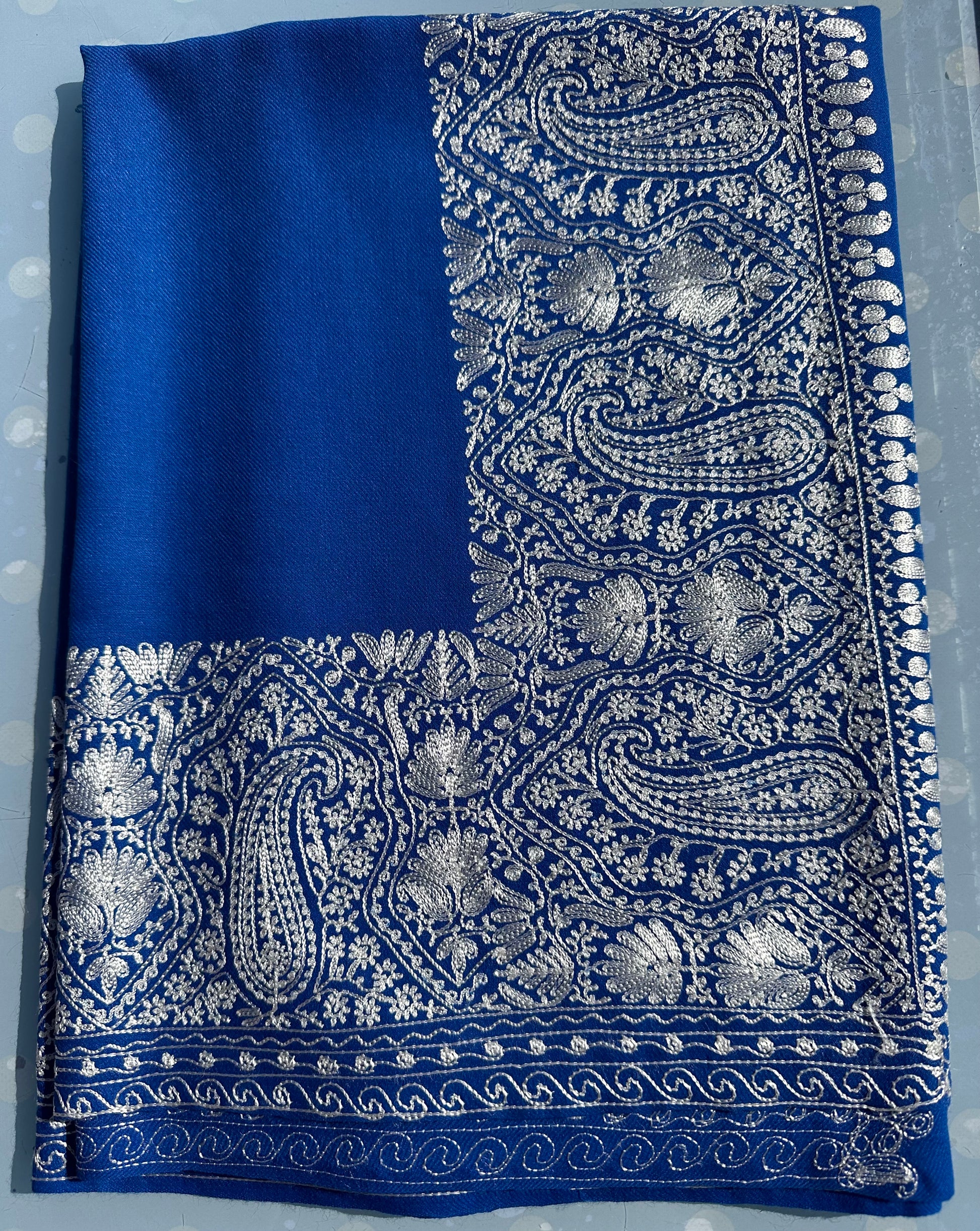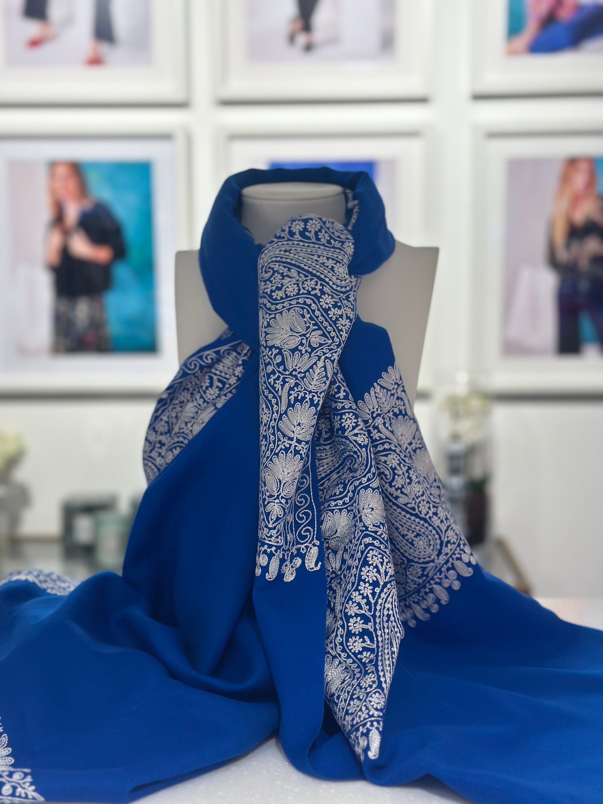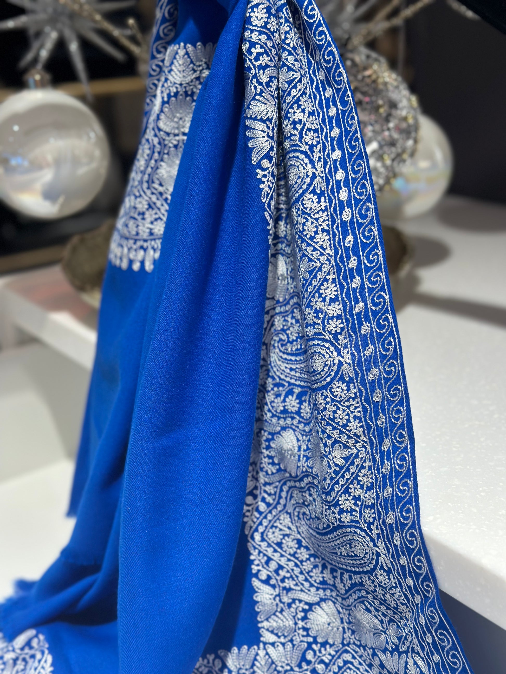 This luxurious wrap is crafted from a soft cashmere-wool blend, offering the perfect combination of warmth and elegance. The deep royal blue sapphire hue of the fabric exudes richness and sophistication, while the intricate metallic silver threadwork adds a touch of shimmering contrast. The silver embroidery delicately traces across the wrap, enhancing its striking color with an added layer of opulence. Soft to the touch yet visually captivating, this wrap is a true statement piece that effortlessly elevates any outfit, blending comfort with refined, timeless beauty.