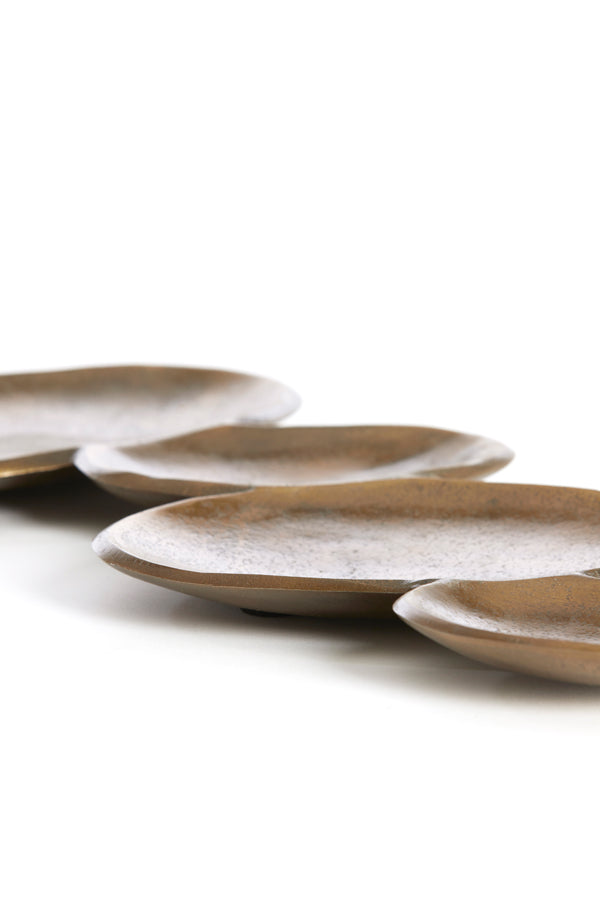 Each "pebble" section has a slightly different shape and size, giving the dish a fluid, sculptural quality that feels both artistic and grounded in nature. The polished surface reflects light in soft, shifting highlights, enhancing the texture of the "pebbles" while inviting the touch. This brass pebble dish could serve as a decorative centerpiece, a catch-all for small treasures, or a sophisticated accent on a coffee table, bringing a subtle, earthy elegance to any space.