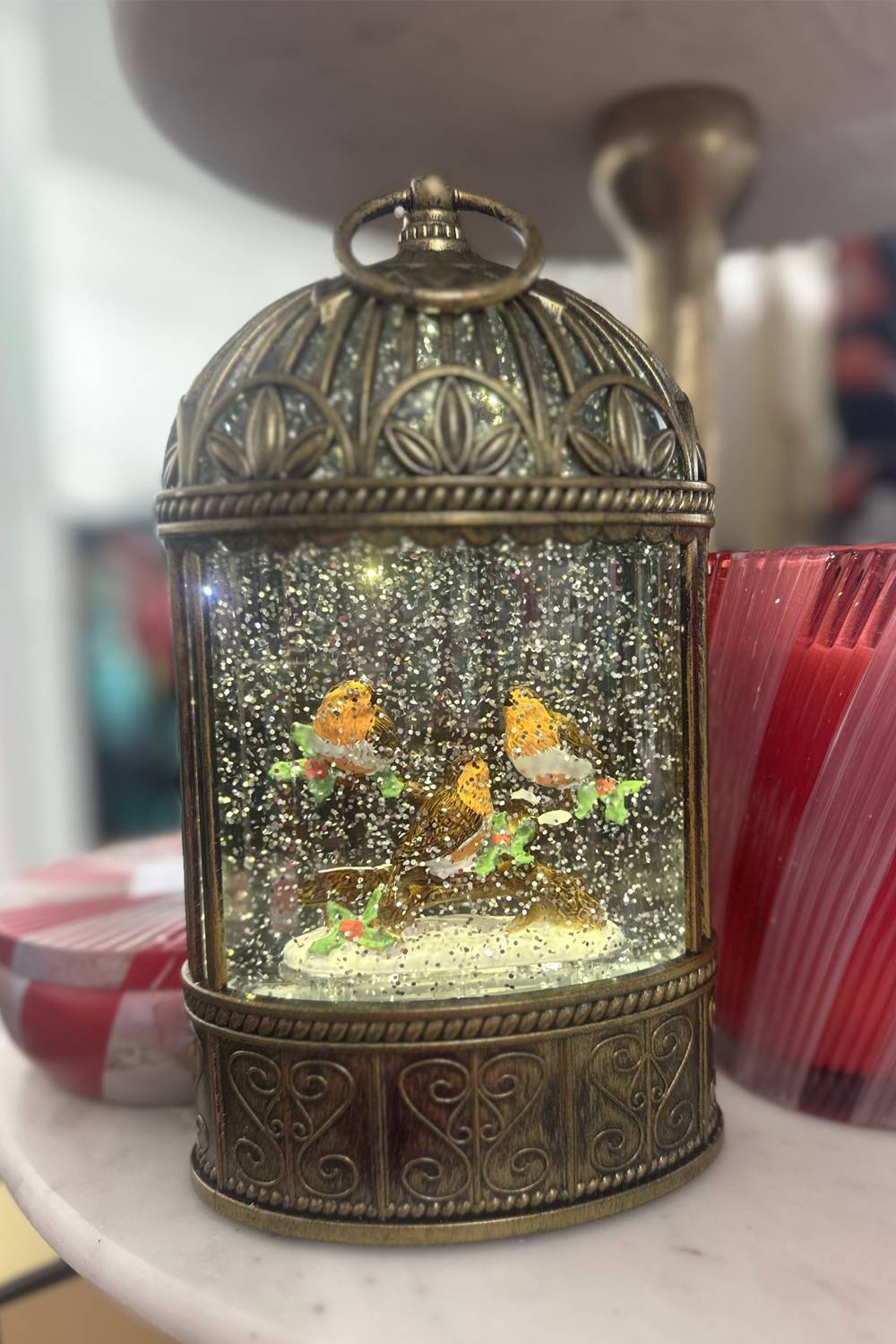 A charming winter wonderland captured in glass—this snowglobe features a delicate robin nestled among swirling snowflakes inside a beautifully detailed aviary. With every gentle shake, the scene comes alive in a flurry of festive magic. A timeless keepsake that brings warmth, nostalgia, and a touch of enchantment to any holiday display.