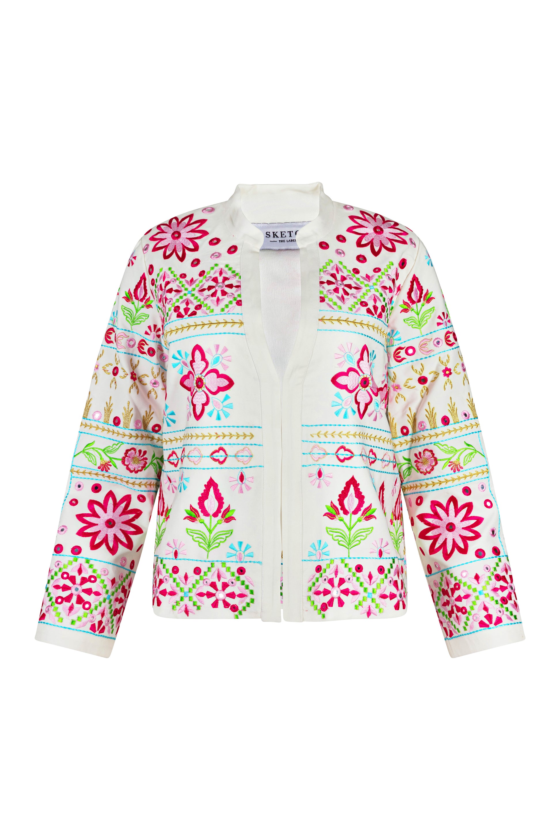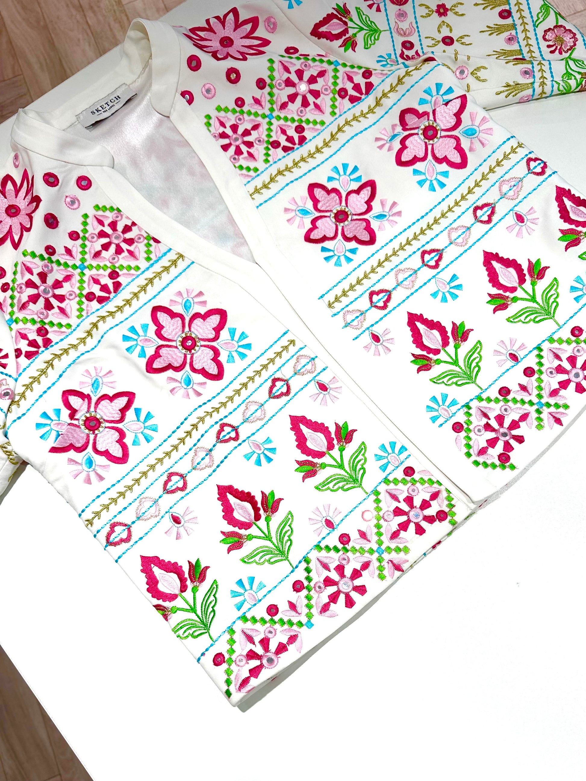 The Addison is decorated all over with colourful floral threadwork embroidery.