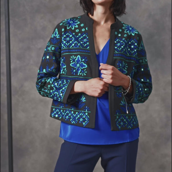 The Addison has a tailored silhouette with fitted shoulders and long sleeves. This piece features threadwork embroidery lovingly applied with delicate attention to detail using a combination of vivid colour hues representative of our seasonal palette.