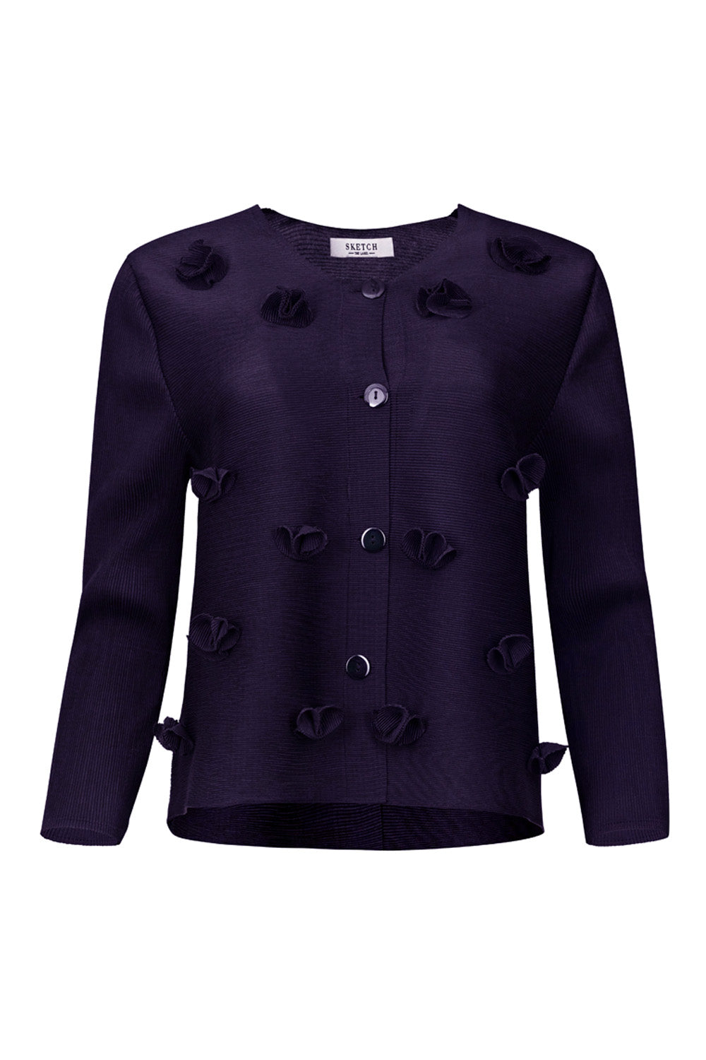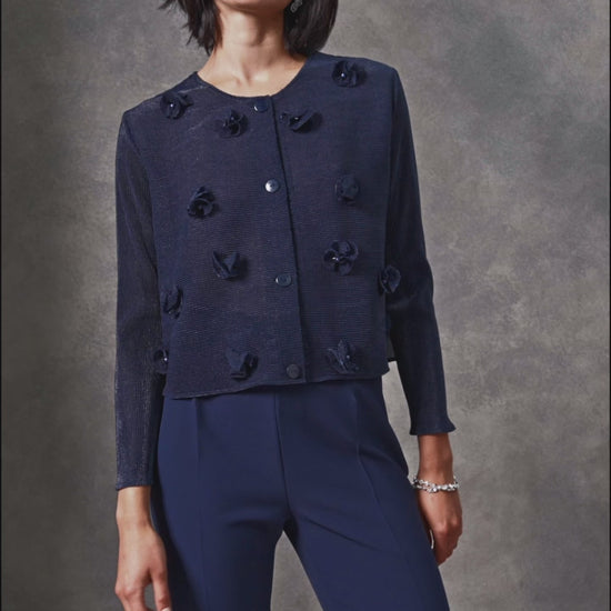 This pleated style jacket features a delicate 3D floral applique detail along its body using traditional French Plisée techniques from St Malo.