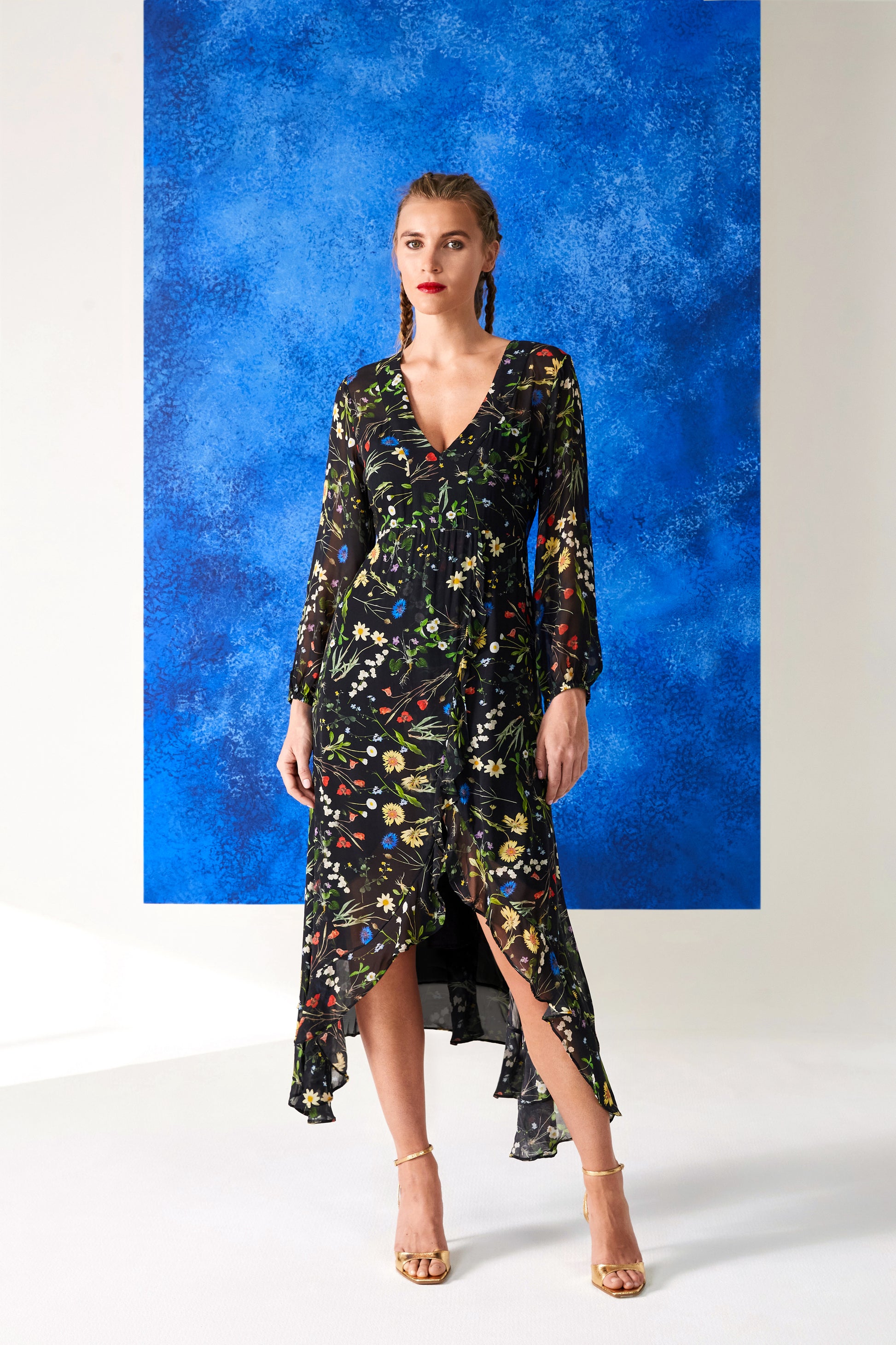 This mid-length georgette dress is a beautifully designed piece that flatters all body types, effortlessly combining elegance with a touch of romance. The dress features a soft, open-front fishtail ruffle that cascades gracefully down the front, creating fluid movement with each step. This playful detail adds a touch of drama while maintaining the lightweight, airy feel of the georgette fabric.