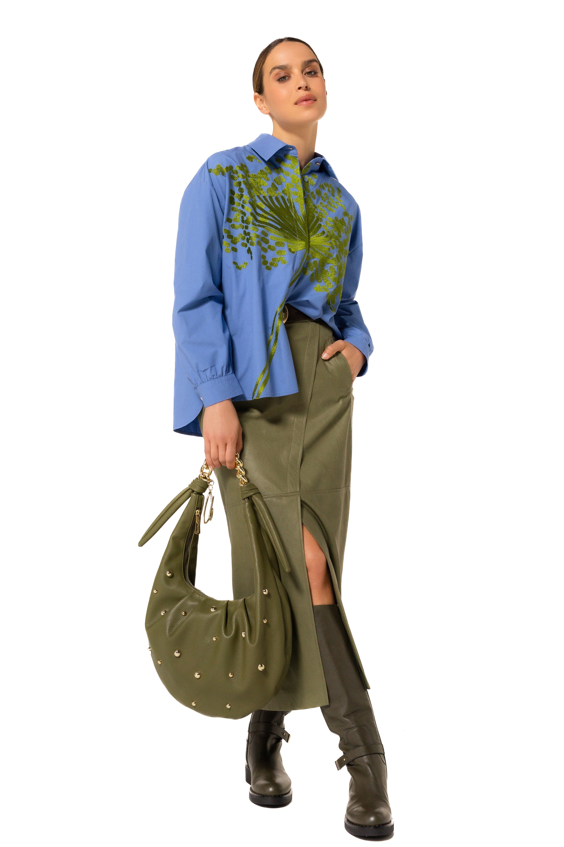 Crafted from high-quality cotton, this sky blue collared shirt combines timeless structure with a touch of escapism. Featuring delicate embroidery of a magnificent palm tree, it brings together clean tailoring and artisanal detail. A standout piece that reflects the signature Caroline Bliss balance of bold contrasts and refined simplicity.