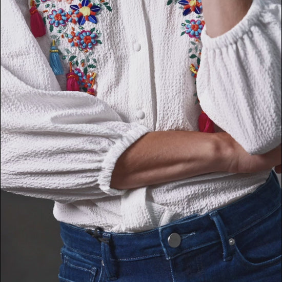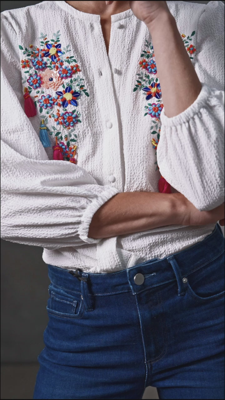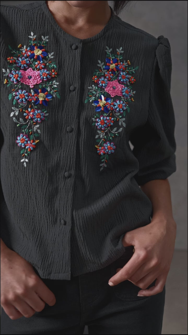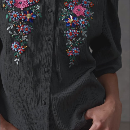 The Marlene - a truly showstopping piece, this magnificent poplin shirt is a celebration of color, craftsmanship, and creativity. Adorned with intricate petal beadwork that shimmers in hues of jade green, sapphire blue, neon pink, and vibrant orange, every detail is thoughtfully placed to create a floral-inspired tapestry of texture and brilliance.