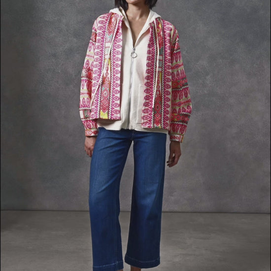 The Nika Jacket has been available in neon pink as per the lead image below. The latest drop will be in a rich seagreen interspersed with pink, gold, and purple.