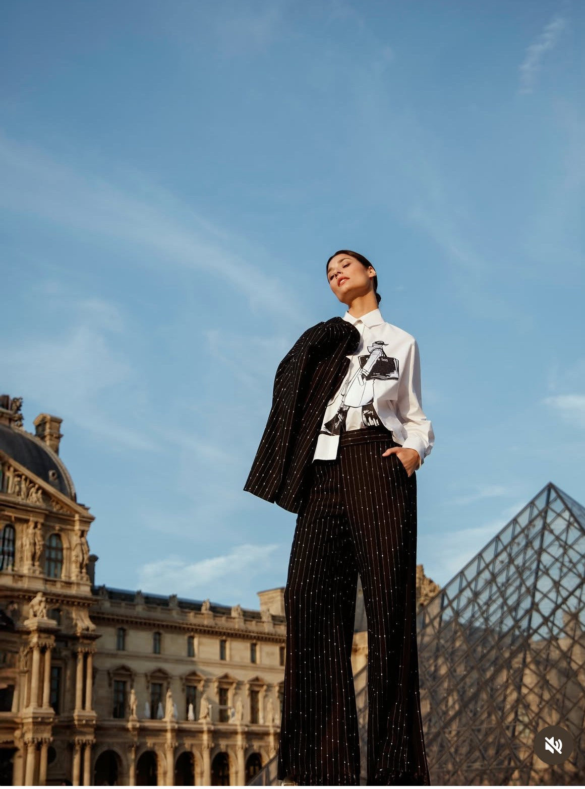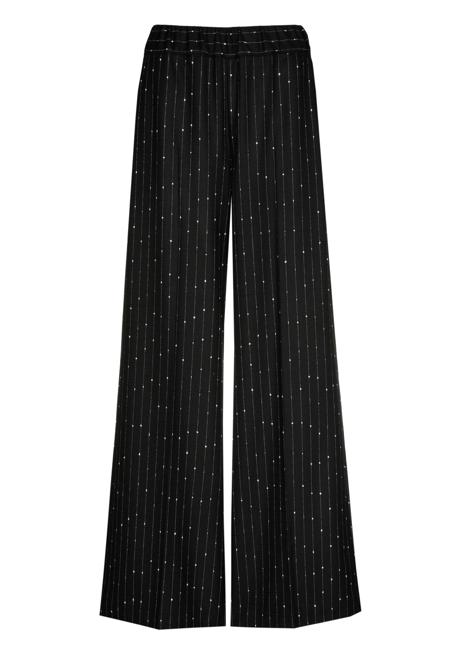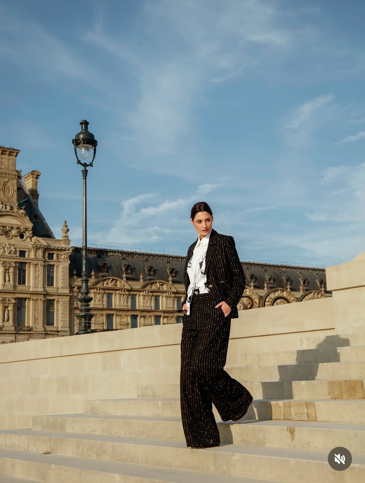 A modern take on classic suiting, this charcoal pinstripe co-ord balances sharp structure with graphic detail. These wide-leg trapeze trousers drape the body with effortless movement. When worn as a set, this outfit redefines power dressing with a distinctly feminine perspective.