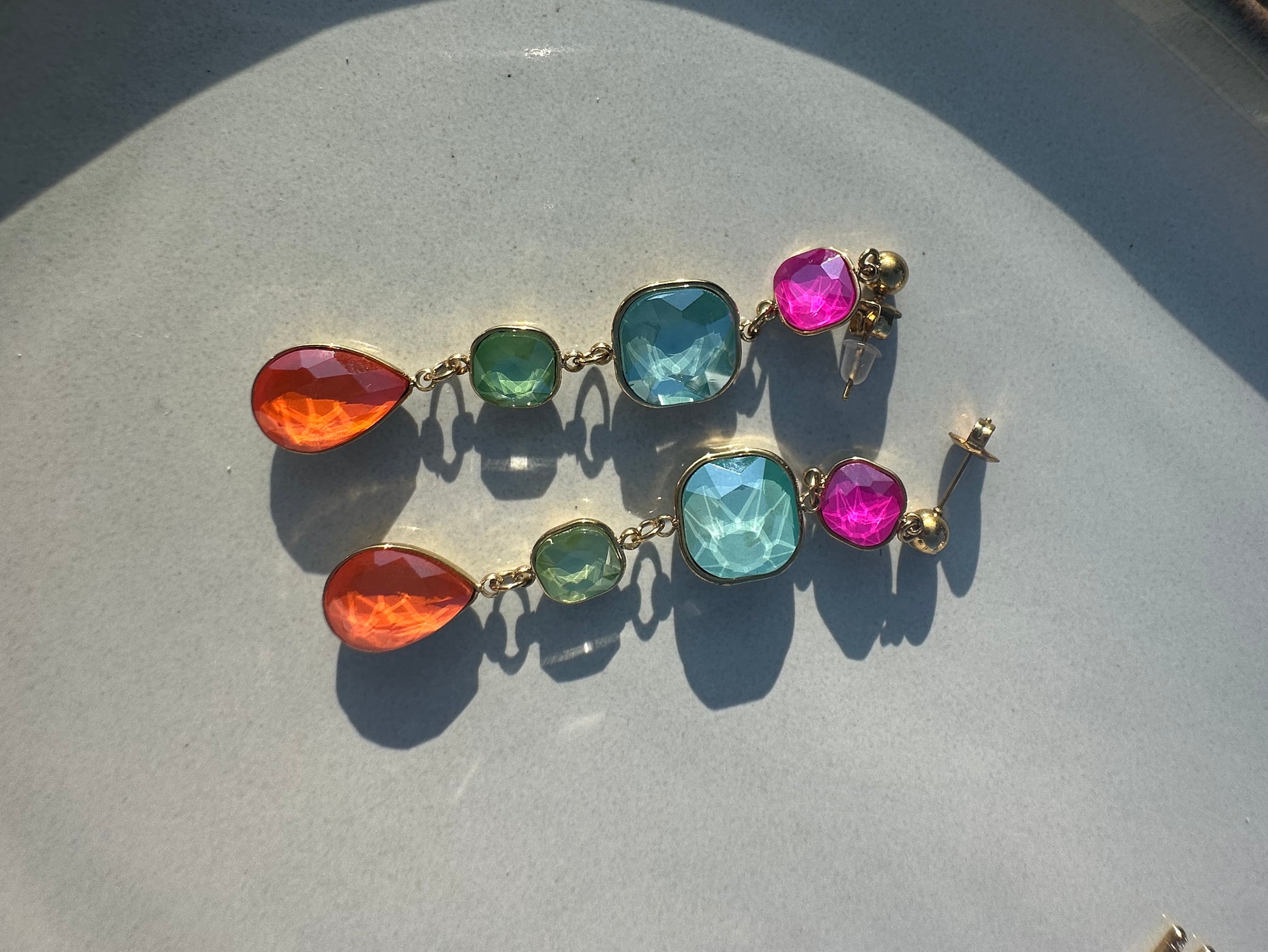 Add a pop of colour and sparkle to any look with these stunning multicoloured gemstone earrings. Set in luxurious gold plating, each earring features an array of vibrant stones that catch the light beautifully, glistening with every movement.