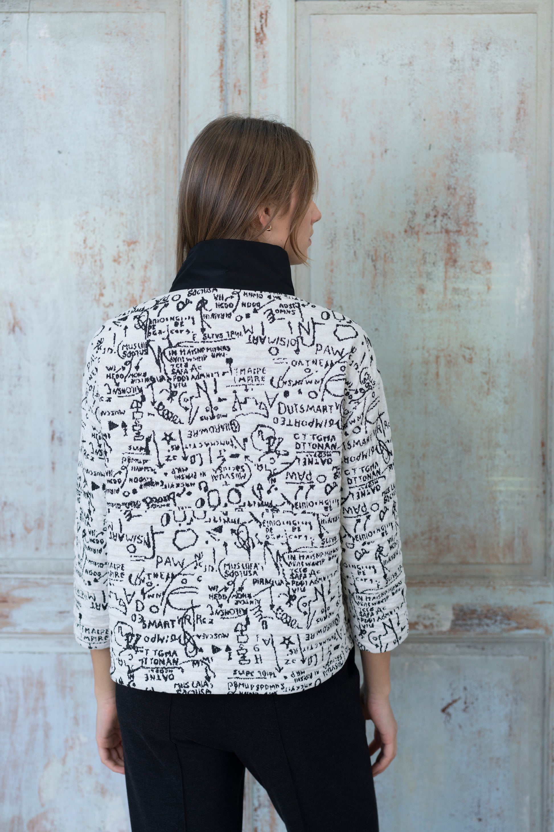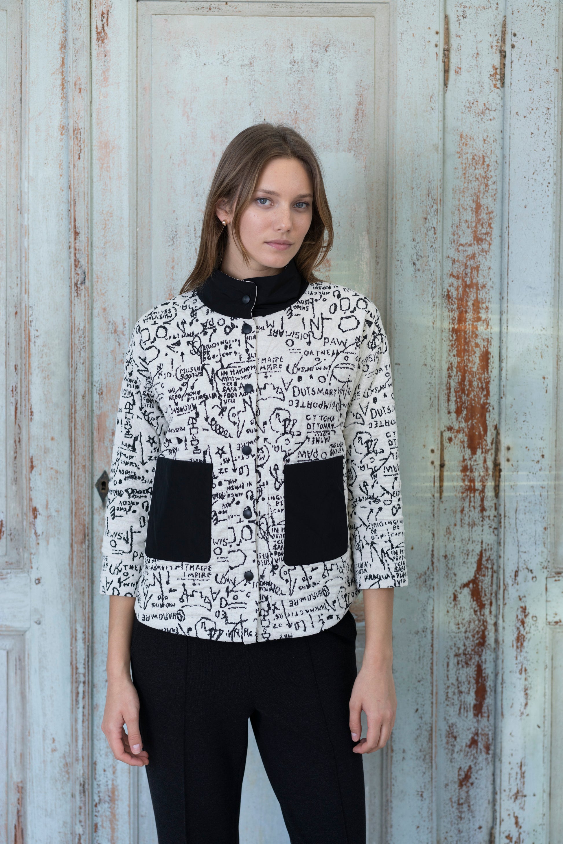 Crafted in San Sebastián by Hongo, this striking padded jacket features a clean ivory base accented with abstract scribble-style writing along the bodice, adding an artistic edge to its classic silhouette.