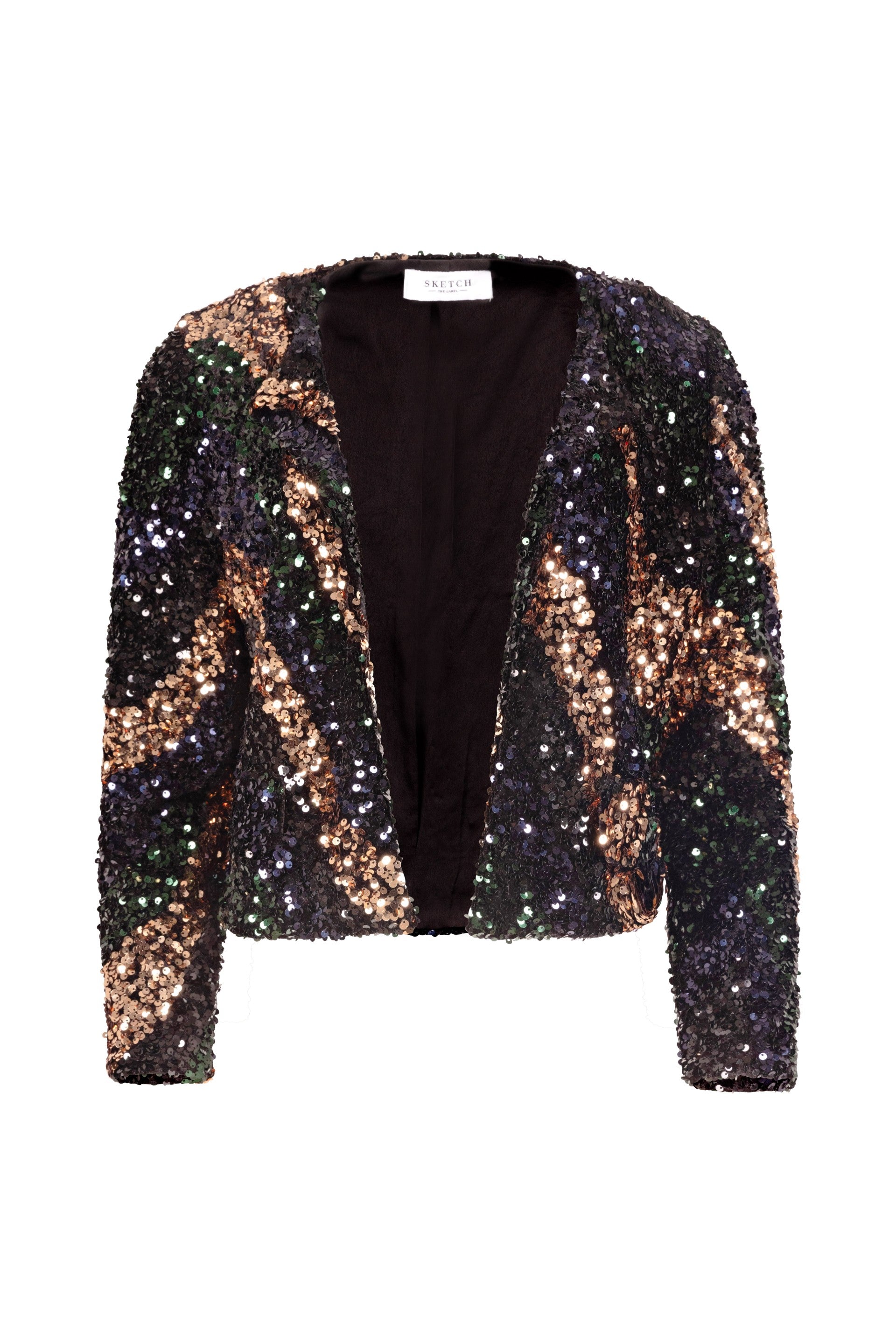 The design is tailored for a flattering fit, with sequins arranged in intricate patterns that reflect light in mesmerizing ways. Whether paired with a sleek black dress or tailored trousers, this jacket is the ultimate statement piece, perfect for any glamorous occasion.