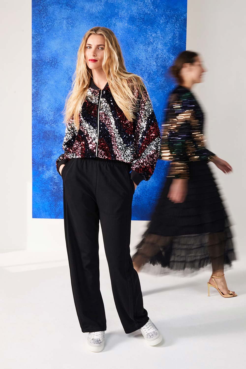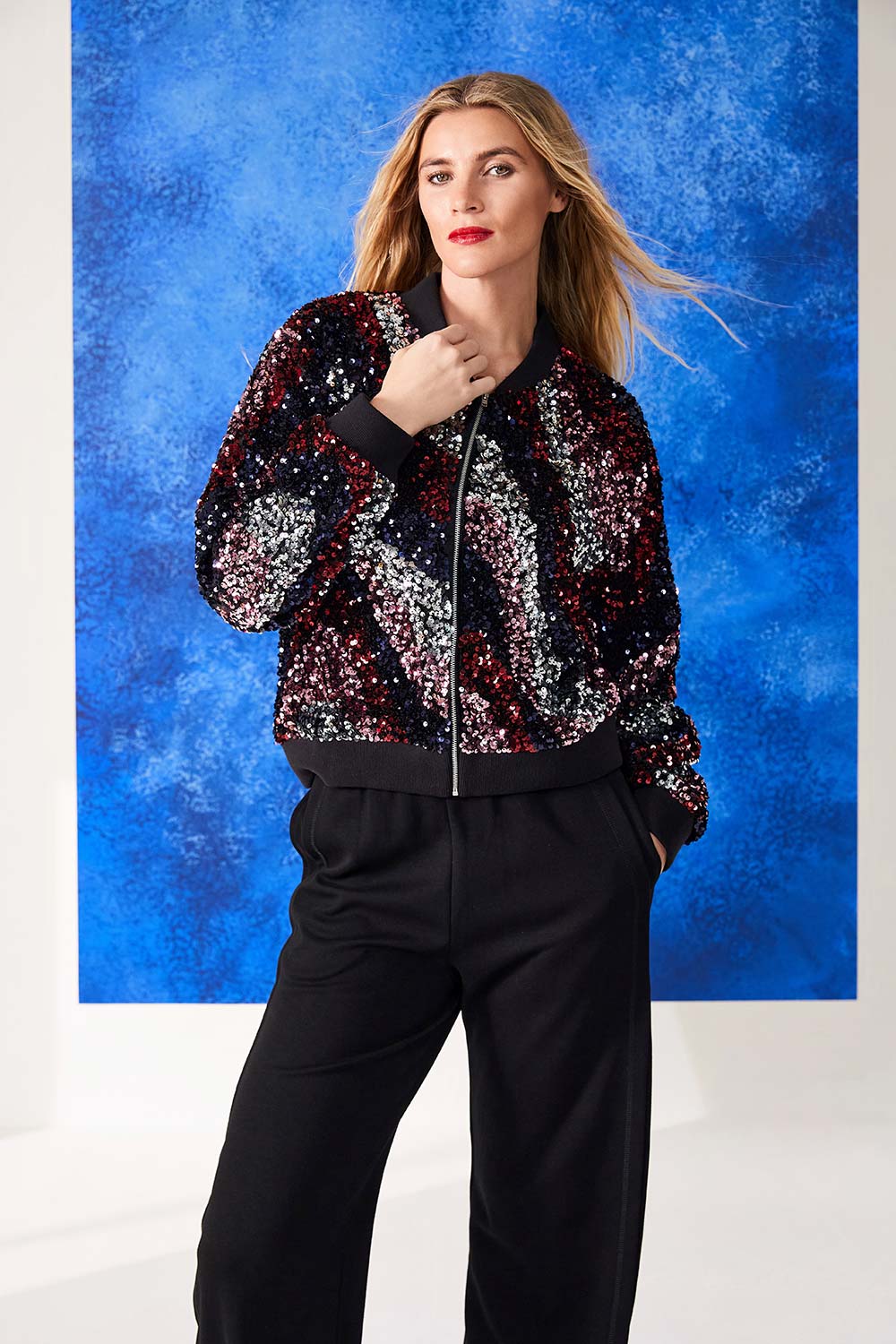 Designed using a black velvet base adorned with cherry red, raspberry pink, metallic silver and jet black sequins, this bomber jacket is sure to make a bold statement.