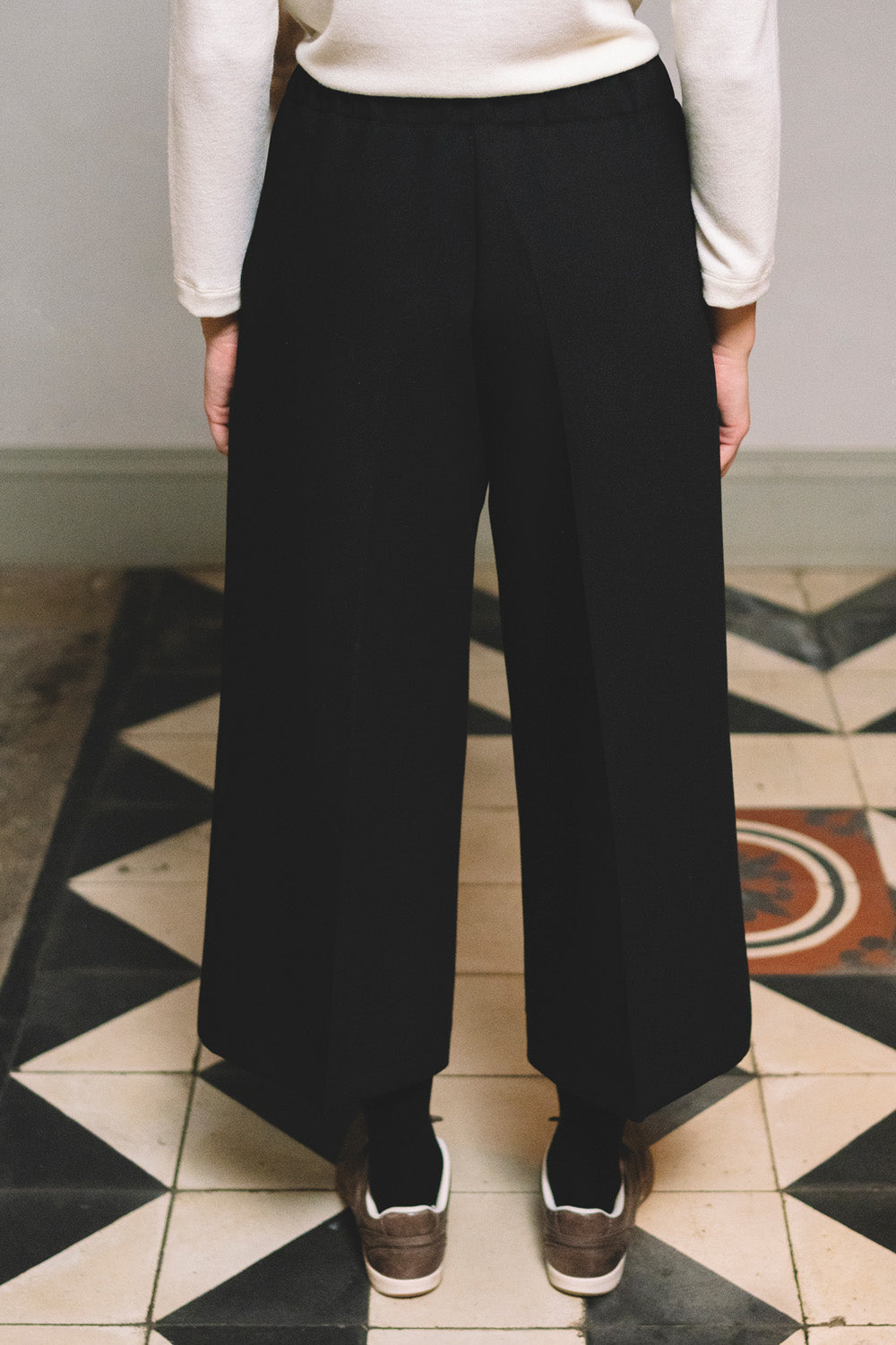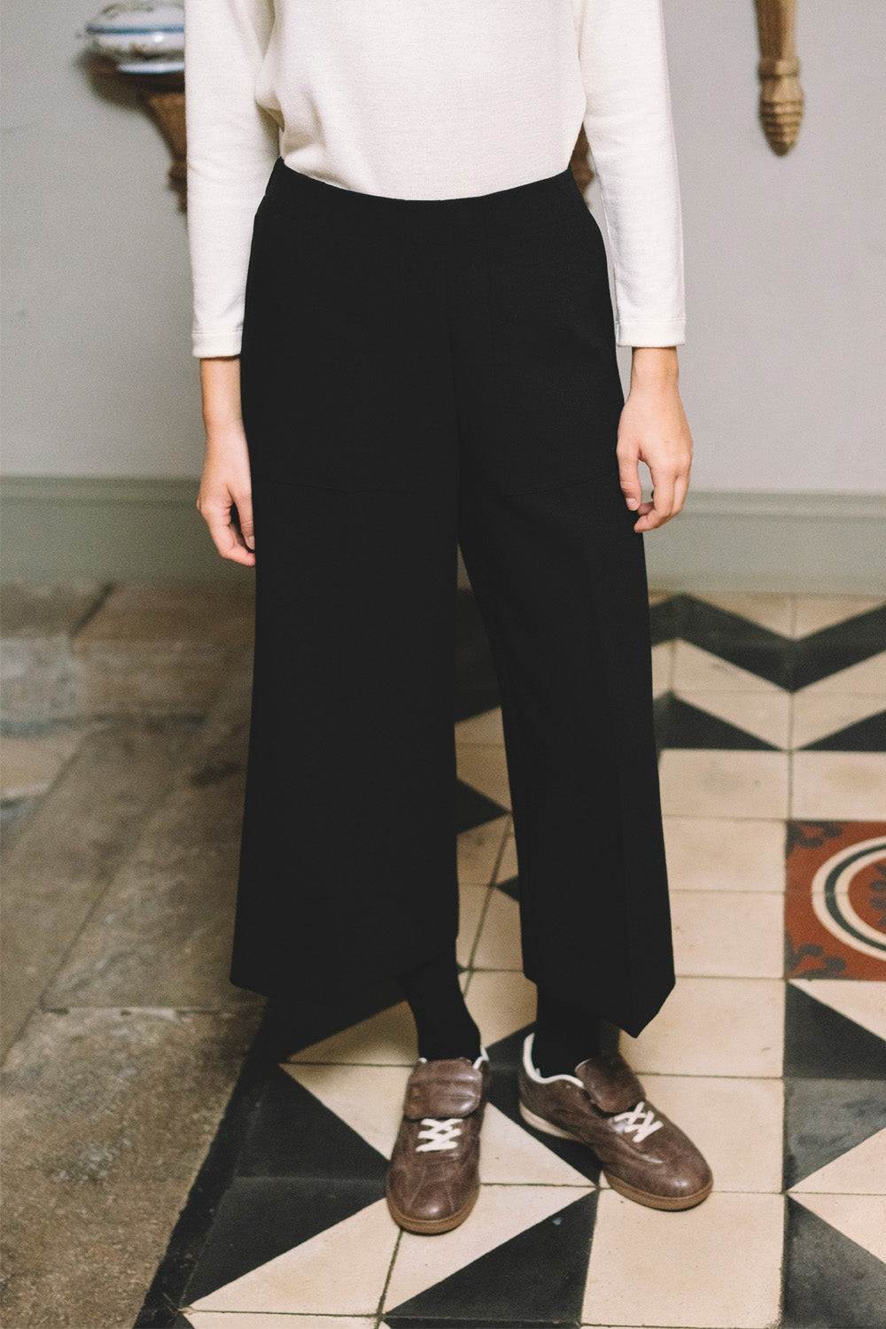 These black wide-leg culottes by Hongo blend structure and ease in a modern, versatile silhouette. Cut to fall just below the knee with a fluid drape, they offer a polished yet relaxed look that works effortlessly from day to night. The tailored waistband balances the wide leg, creating a flattering, elongating shape in a timeless shade of black.