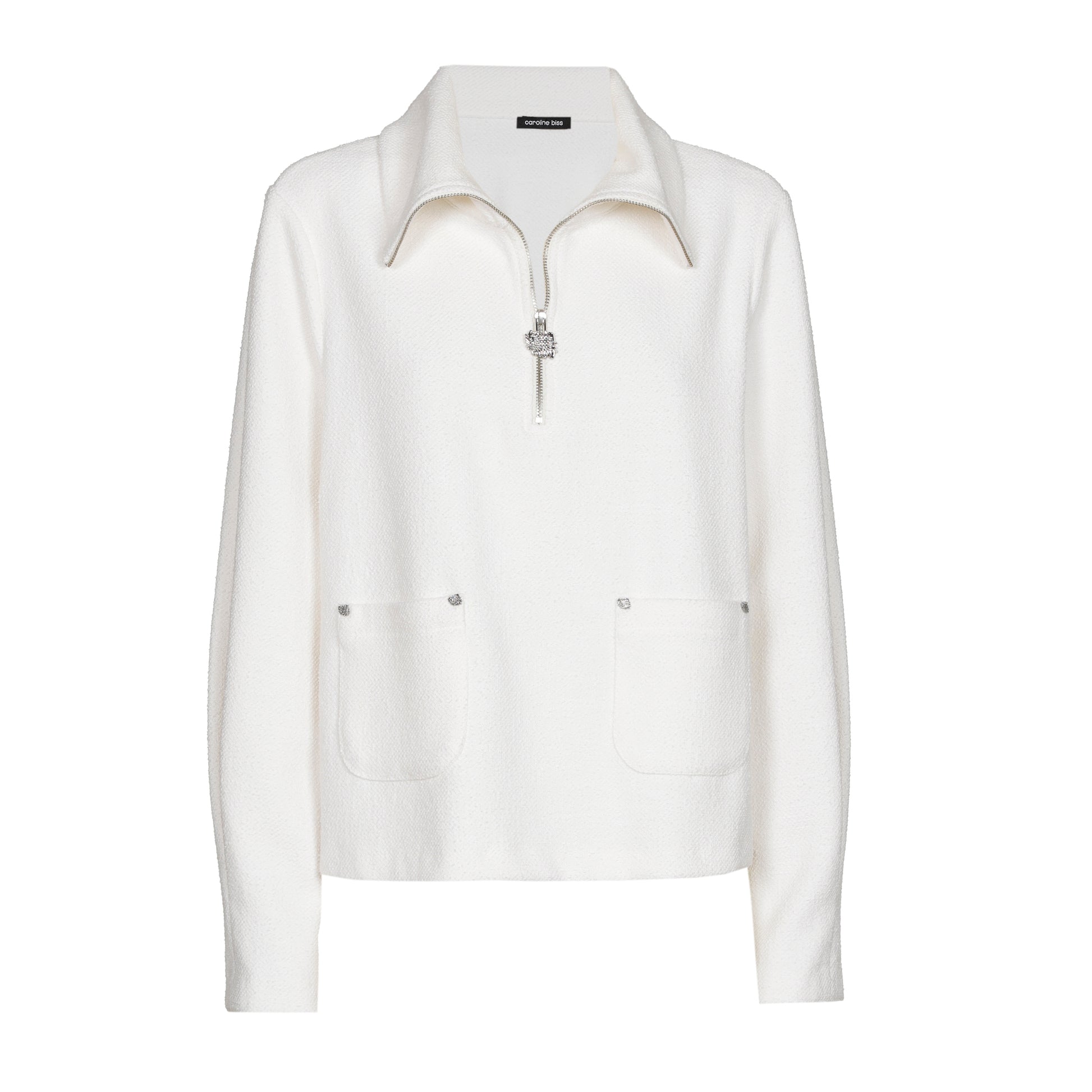 This winter white co-ord reimagines the tracksuit with elevated elegance. Cut in plush bouclé tweed and finished with refined platinum hardware, it blends relaxed structure with a touch of couture polish. Designed for the woman who moves with confidence and style, even off-duty.