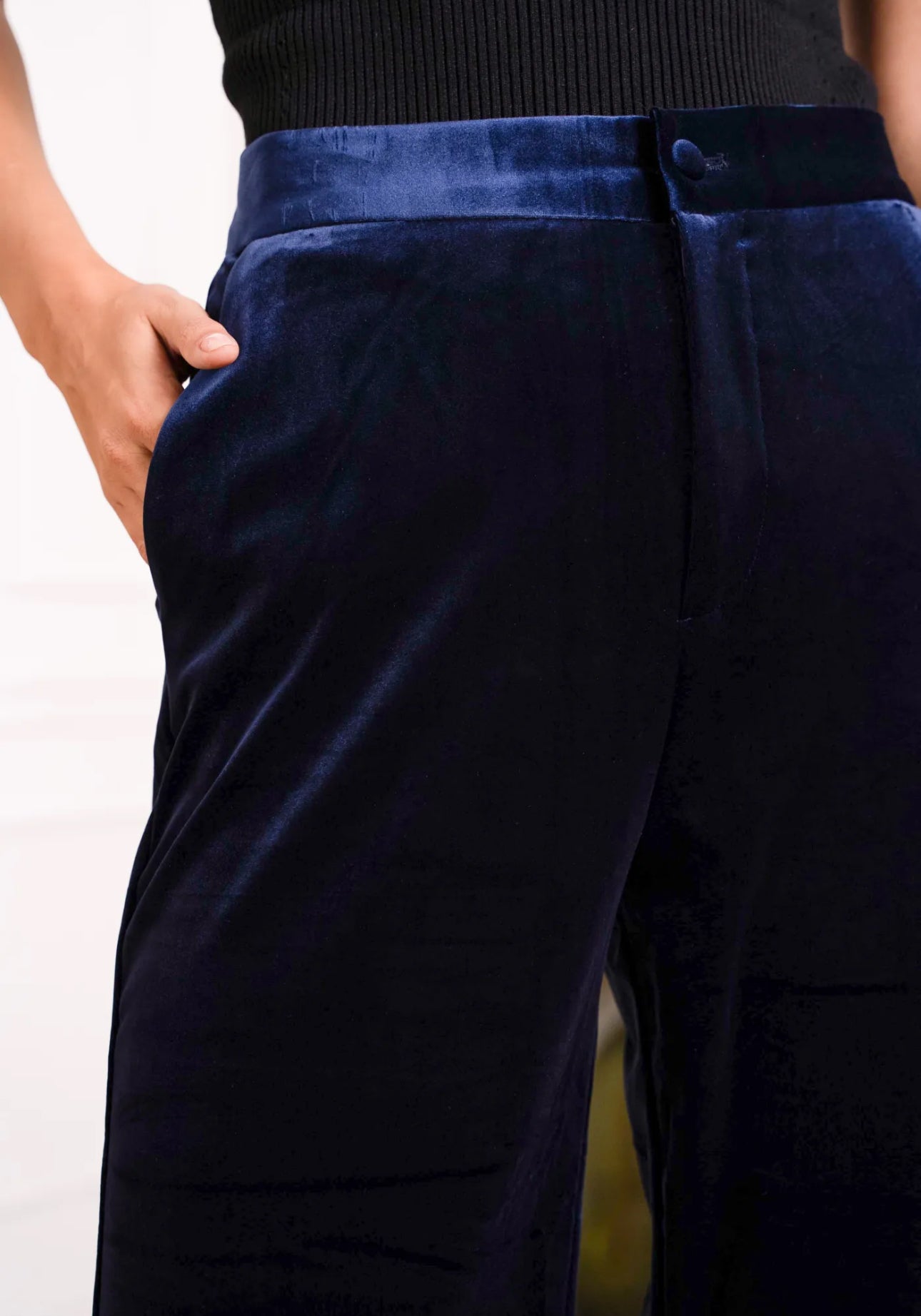 The fit is refined: a mid-to-high rise waist cinches comfortably with a clean waistband, falling into a fluid straight leg that elongates the frame and moves with understated grace. The plush velvet fabric reflects the light with a subtle sheen, echoing the luxurious finish of the Olga blazer while standing confidently on their own.